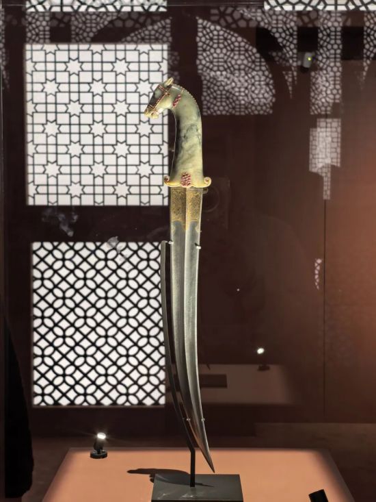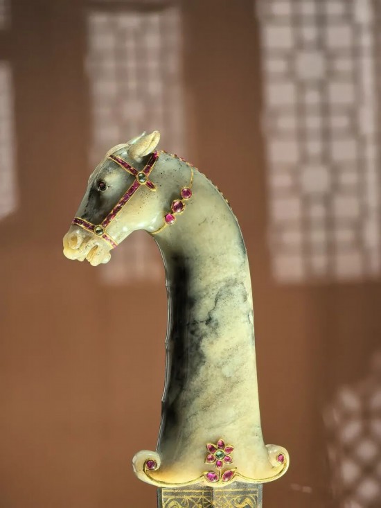 柄:玉雕并嵌红宝石、祖母绿与金;刃:花纹钢与鎏金